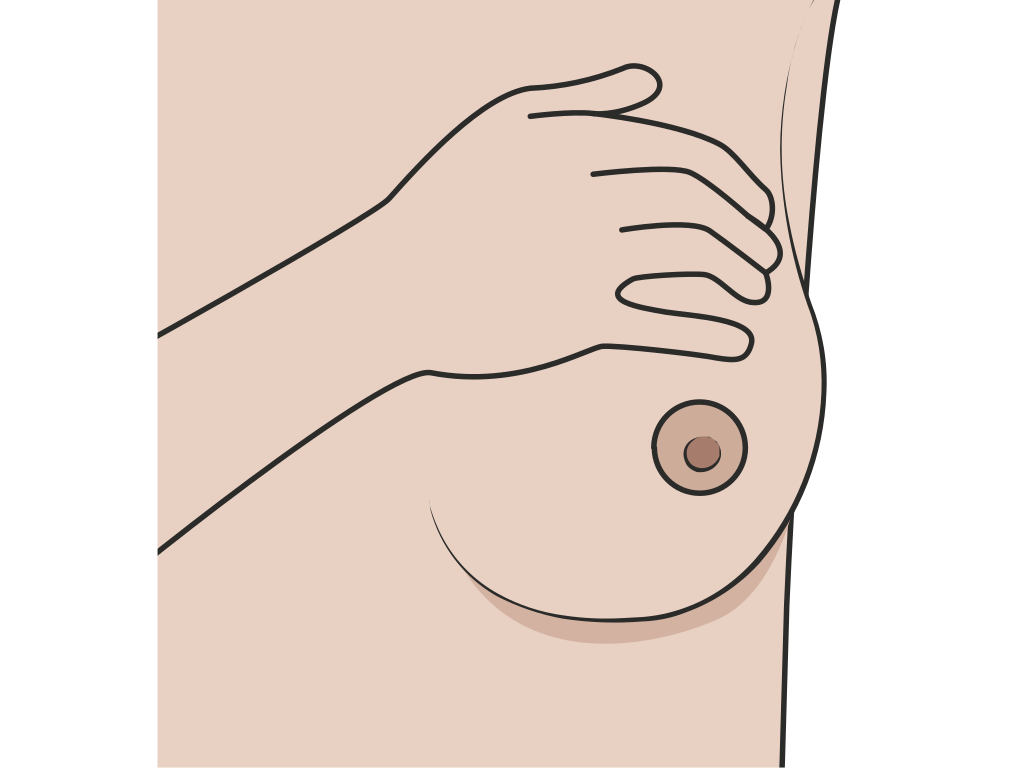 Vous terminez la palpation par le mamelon, c’est-à-dire le bout du sein. Vous pincez doucement le mamelon. Il est possible qu’il ne se passe rien, il est aussi possible que du liquide sorte.