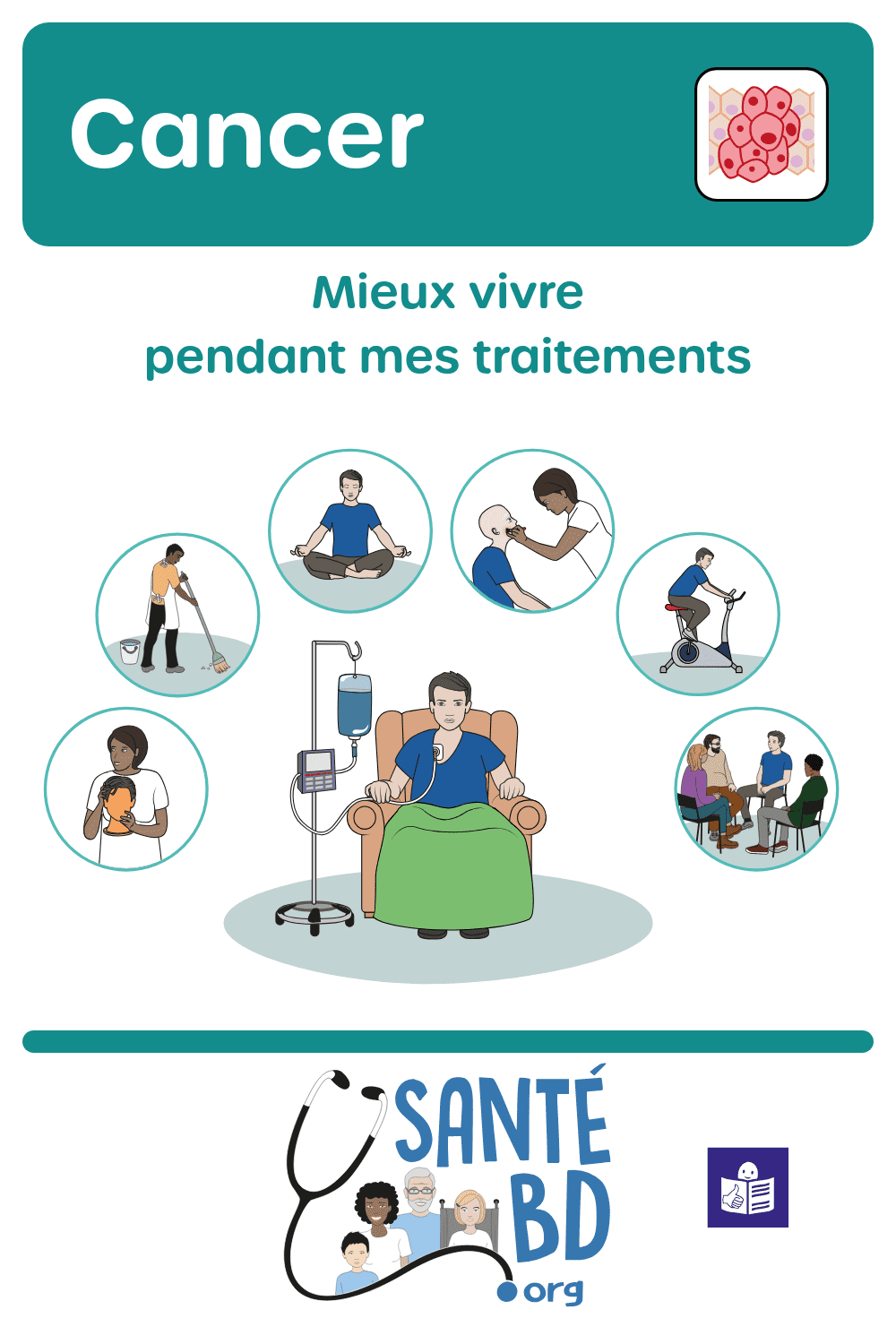 Le traitement d’un cancer comprend des soins de support afin de supporter les effets secondaires des traitements ainsi que les symptômes de la maladie. Pour connaître toutes les aides possibles, SantéBD illustre les soins de support grâce à une bande-dessinée écrite en langage facile à lire et à comprendre. Une adaptation de cette BD est disponible aussi pour les enfants ou les personnes atteintes d’un trouble du spectre de l’autisme.